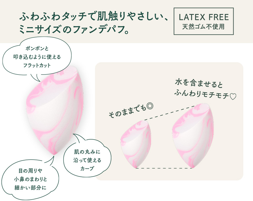 ふわふわタッチで肌触りやさしい、ミニサイズのファンデパフ。